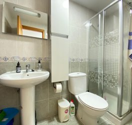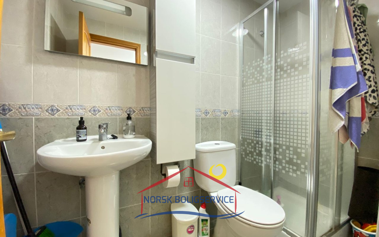 - Det vakre, nye badet er flislagt i en elegant gråtone med dekorative detaljer. Det har dusj med glassdør, toalett, servant og et praktisk skap med stort speil.