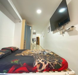 - Stue- og soveområdet har en stor seng, sofa, salongbord og en stor veggmontert TV. Selvfølgelig kan du endre innredningen for å tilpasse den til din egen stil. Det finnes også et stort oppbevaringsskap i moderne design. Dette området har et stort vindu som slipper inn rikelig med naturlig lys.