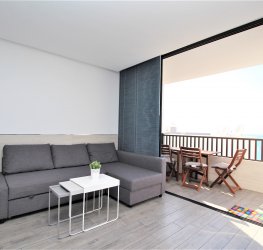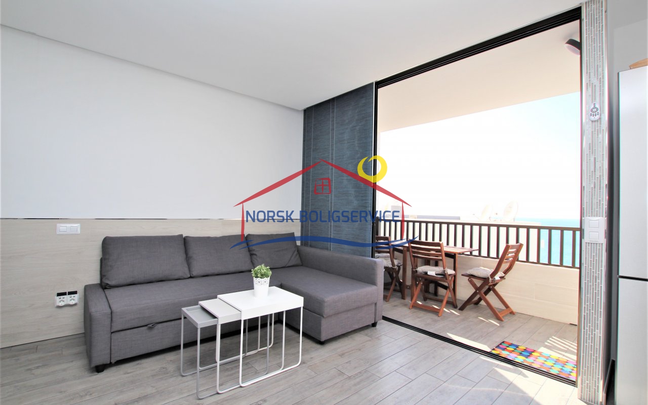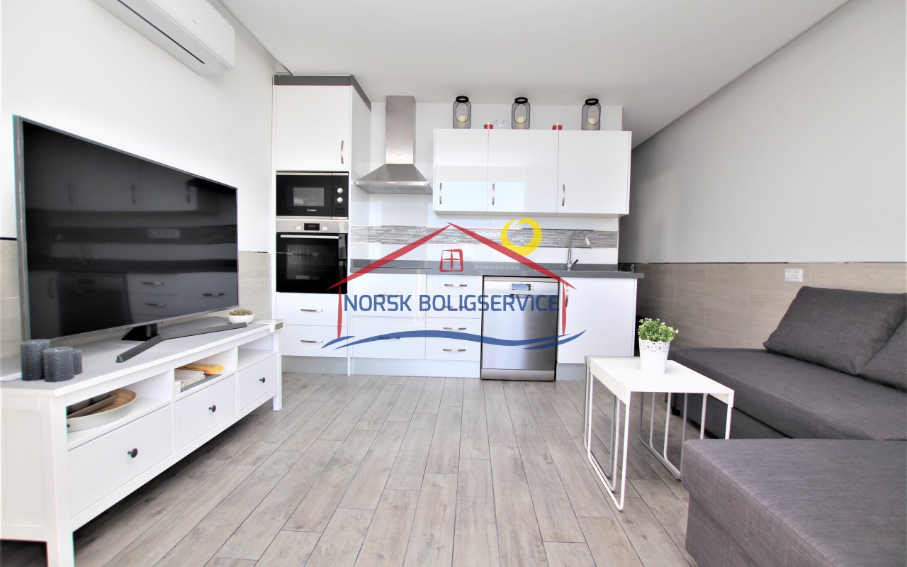 Stue med sovesofa, møbler, TV, klimaanlegg, skyvedører i glass gir en enda større plass sammen med terrassen
