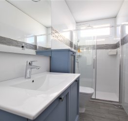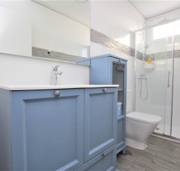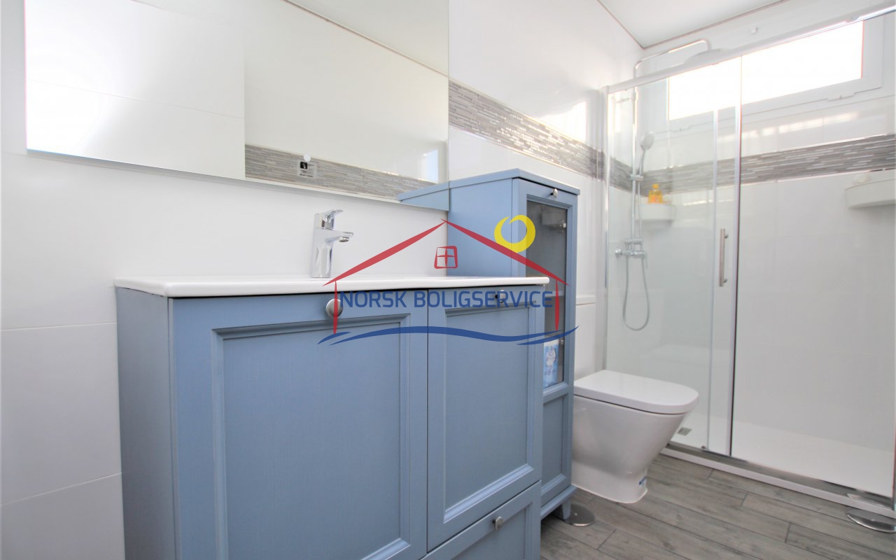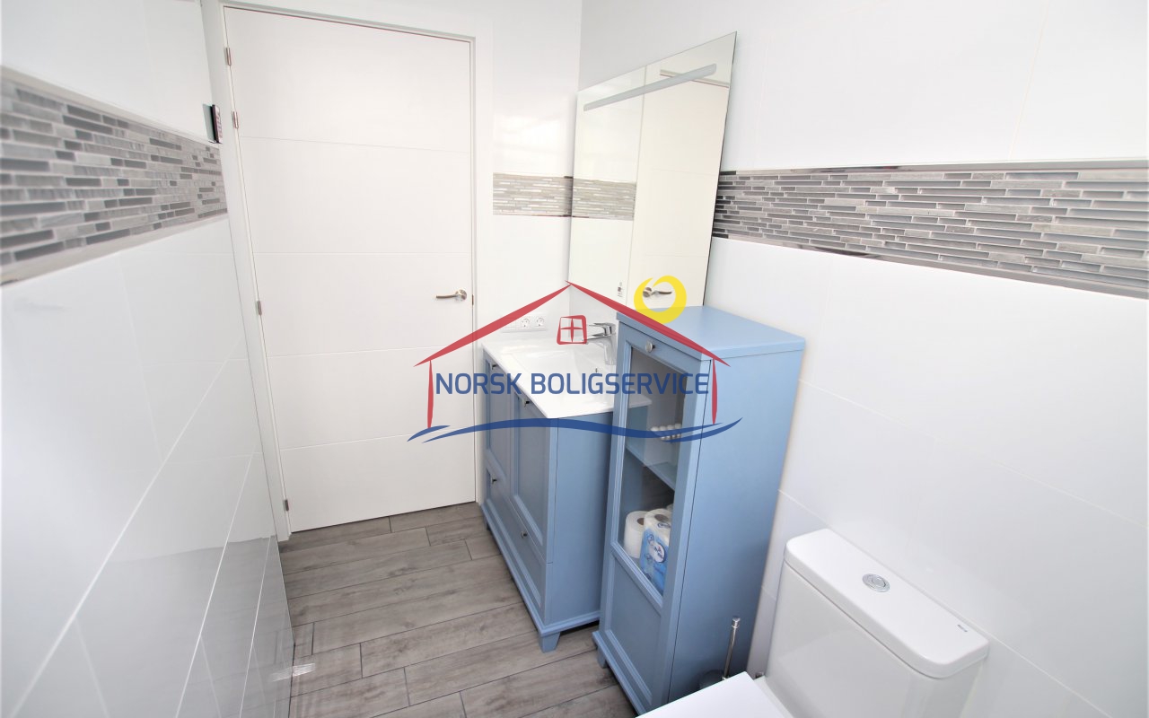 Bad med stor dusj, WC, skap, vaskemaskin, tørketrommel