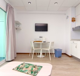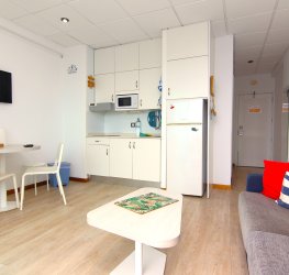 - Koselig og fargerik stue/kjøkken. Det har det essensielle for matlaging og et stort spisebord. Dette området er forbundet med terrassen foran, slik at utsikten og naturlig lys er garantert.