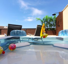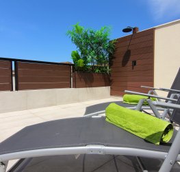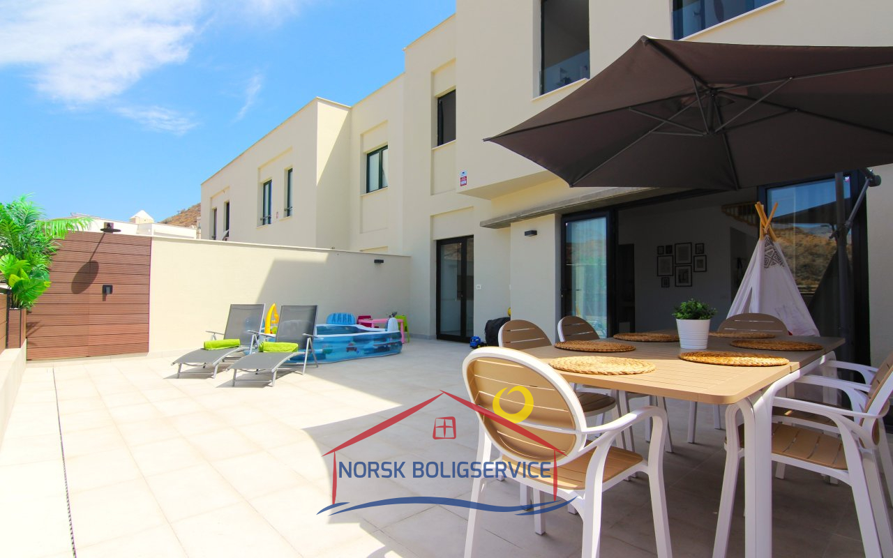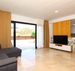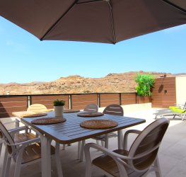 Stor terrasse på forsiden med utsikt over Puerto Rico-dalen. Det er et ideelt område for å nyte det gode klimaet i området. Den har solsenger, bord, stoler og en parasoll for å spise ute når du vil, og har også en dusj for å kjøle deg ned på de varmeste dagene.