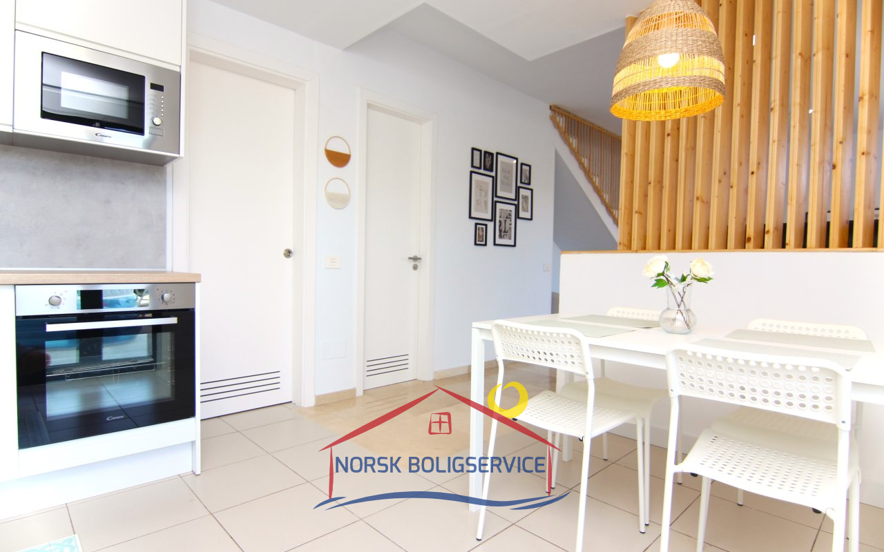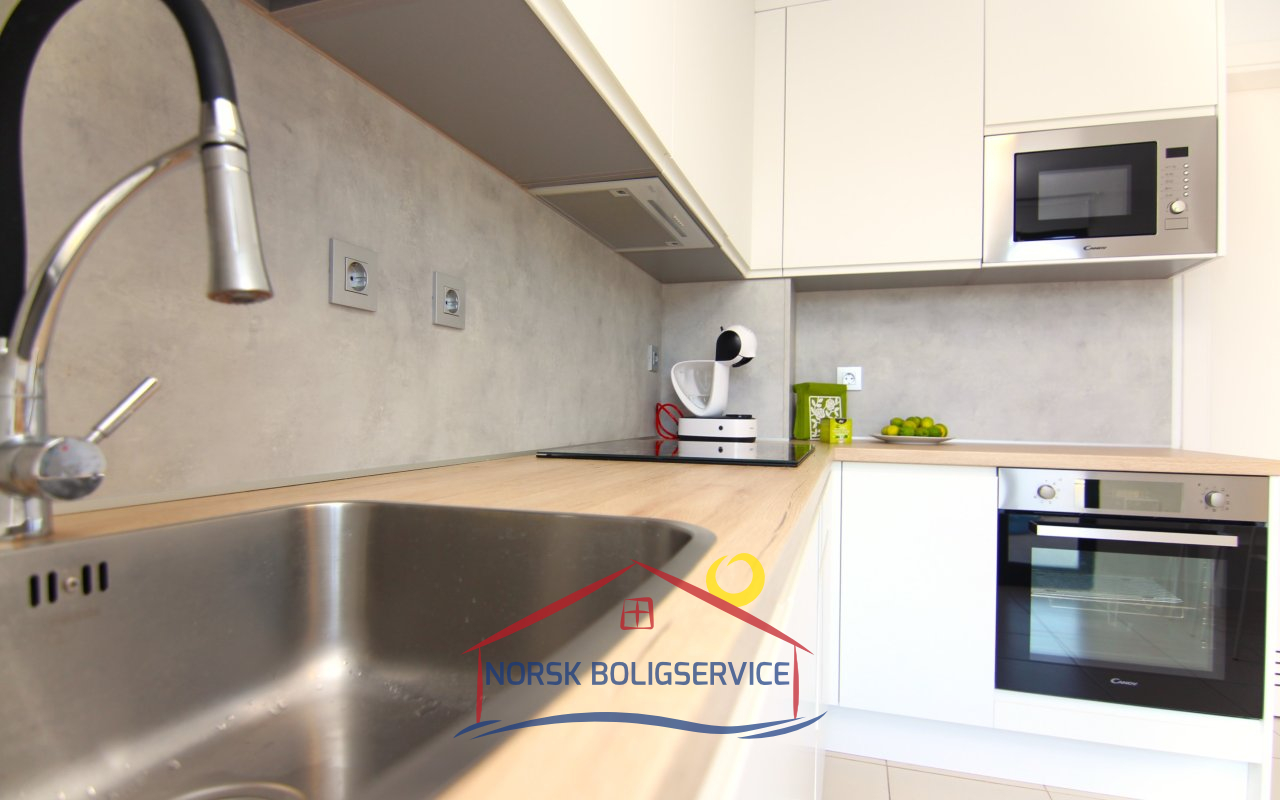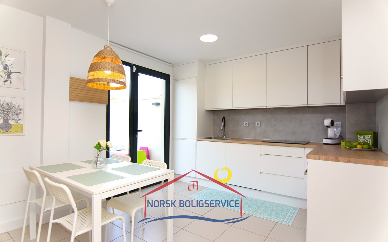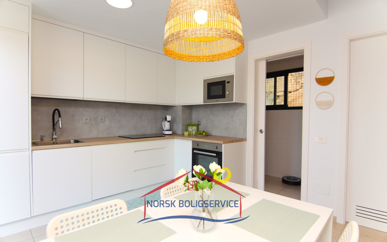 Nydelig fullt utstyrt kjøkken. Det har stekeovn, kjøleskap, keramisk topp og mikrobølgeovn. I tillegg har det en glassdør som gir direkte utgang til terrassen foran og lar naturlig lys slippe inn store deler av dagen.