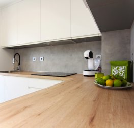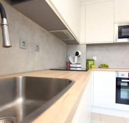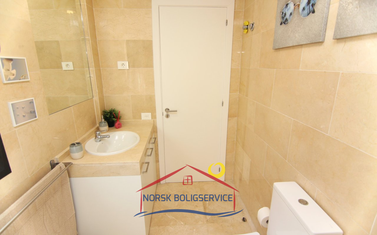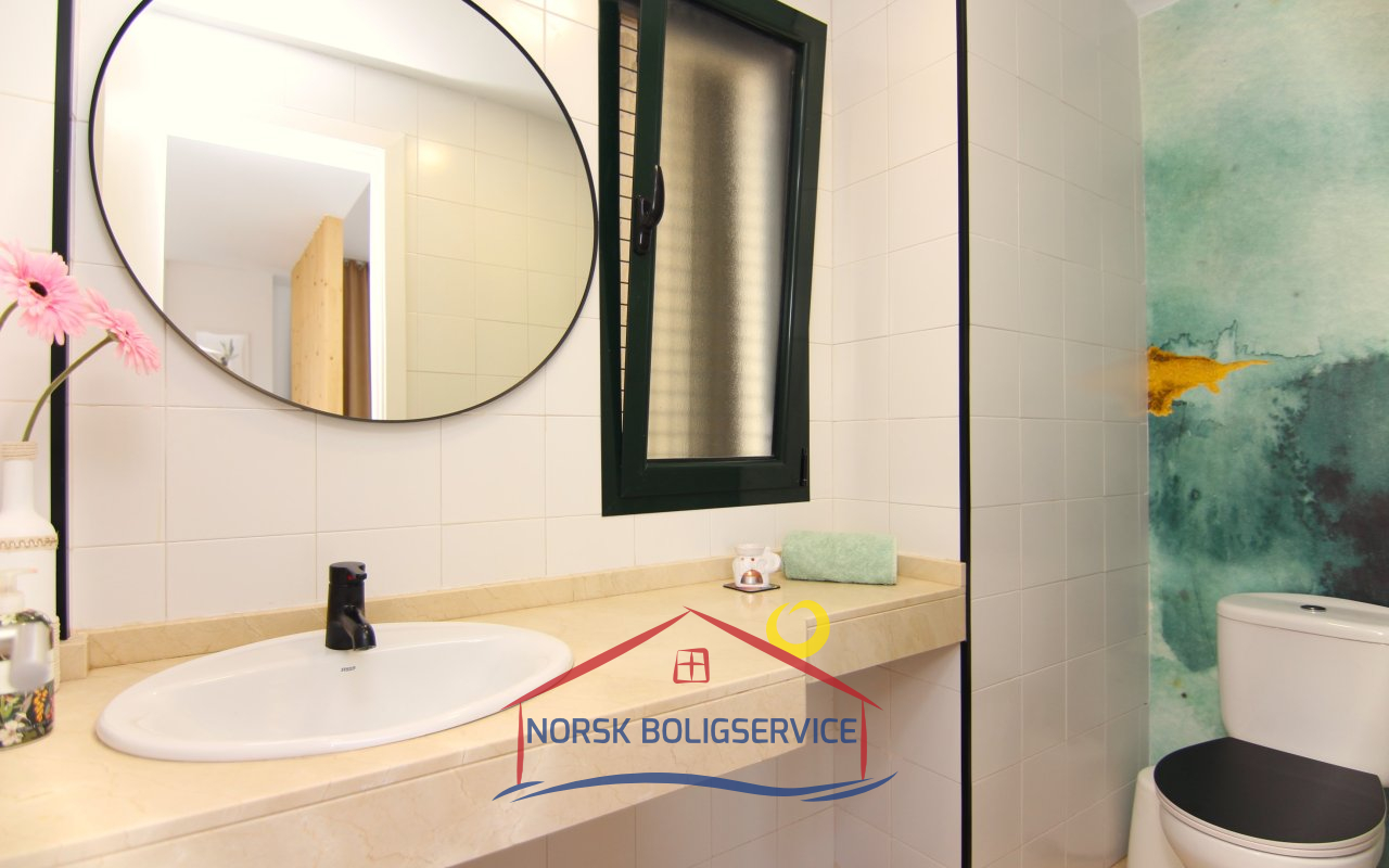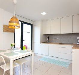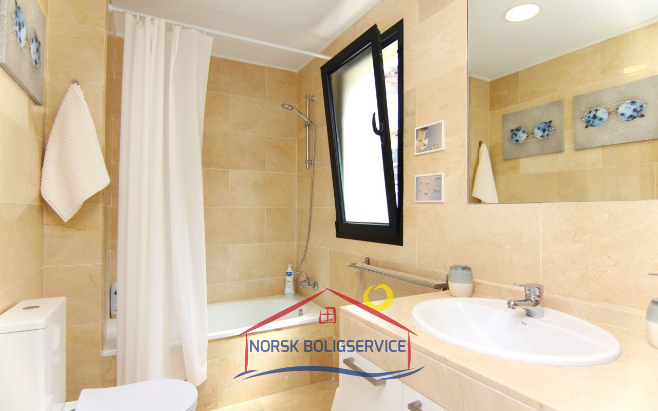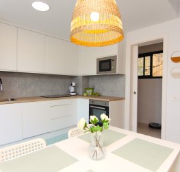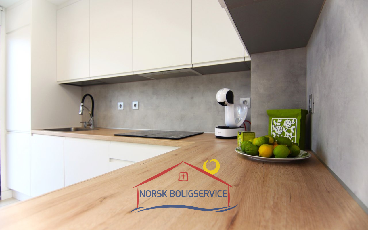 Nydelig fullt utstyrt kjøkken. Det har stekeovn, kjøleskap, keramisk topp og mikrobølgeovn. I tillegg har det en glassdør som gir direkte utgang til terrassen foran og lar naturlig lys slippe inn store deler av dagen.