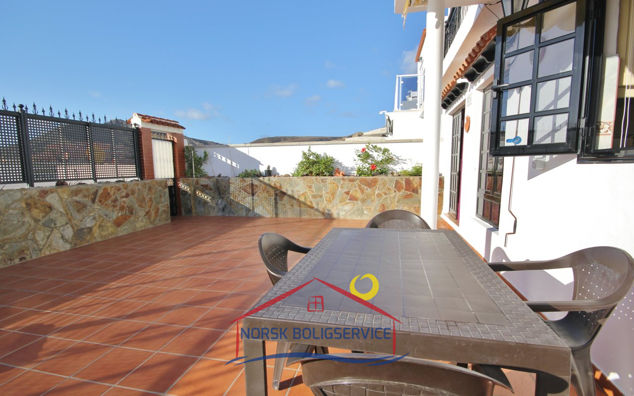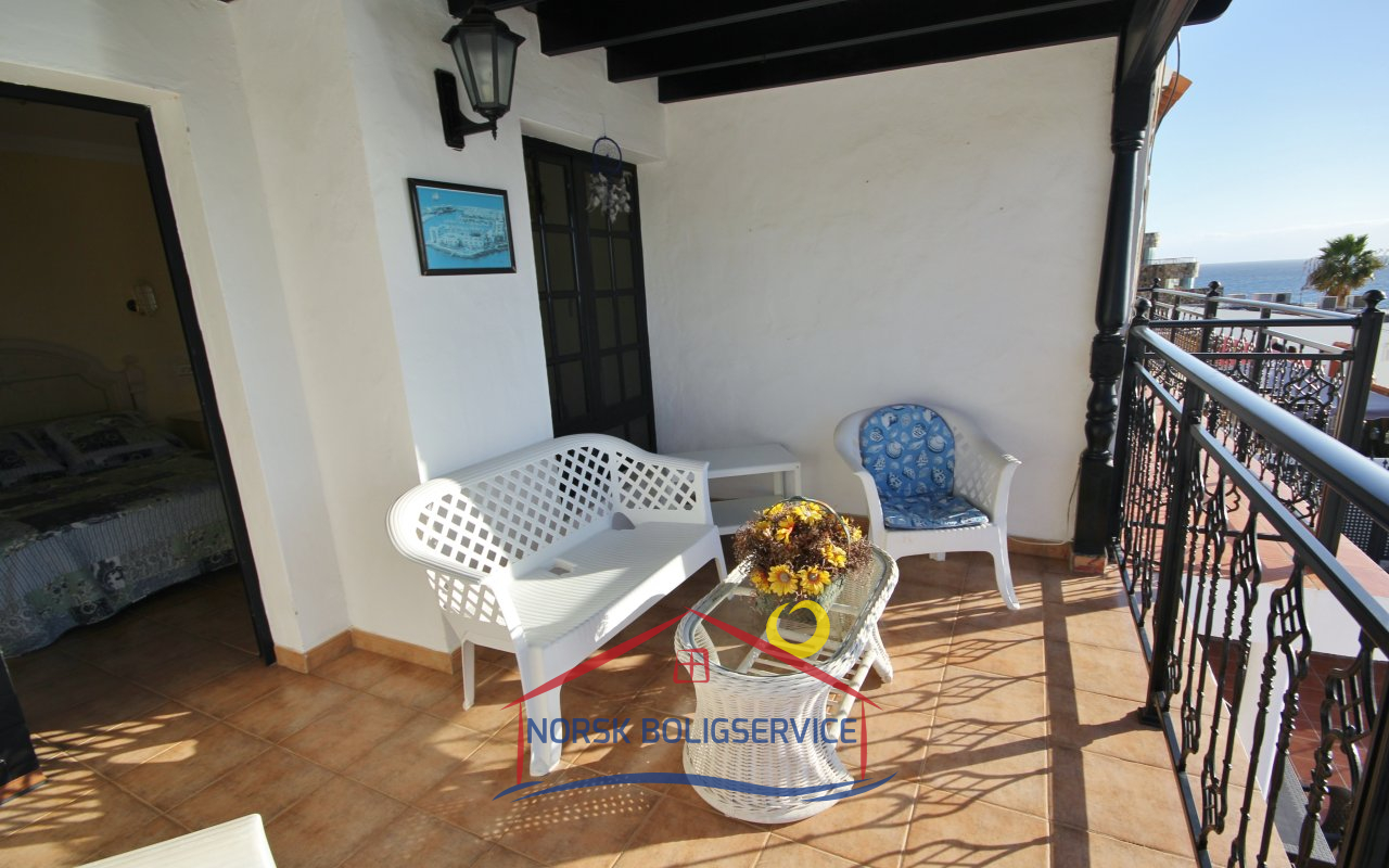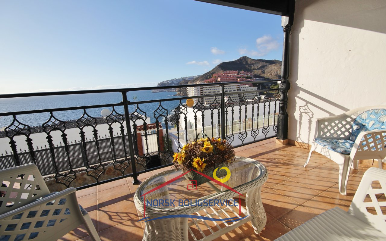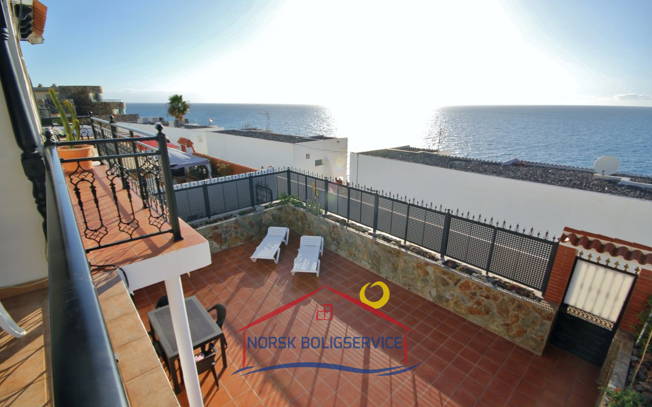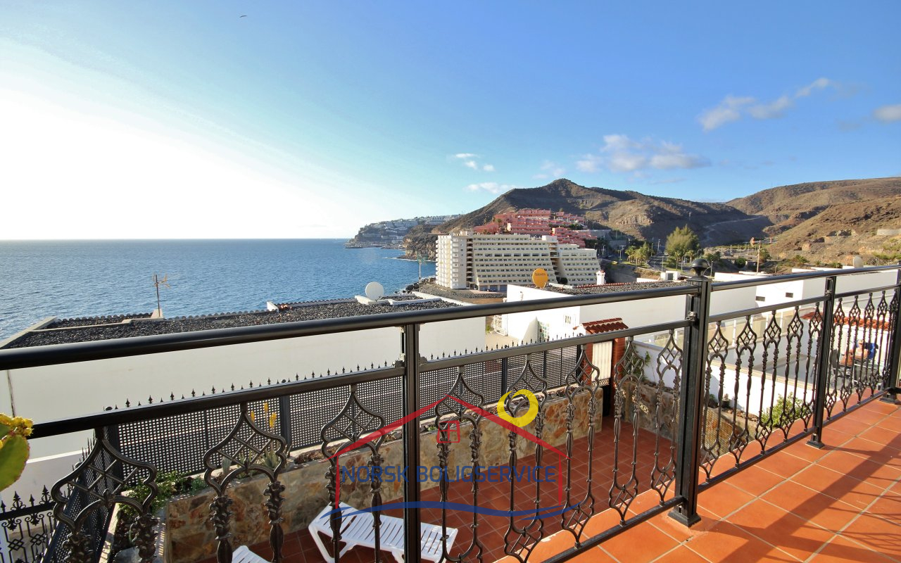 Fott rekkehus i Los Caideros. God standard. Stor solrik terrasse og balkong med flott havutsikt. 3 soverom og 2 bad med dusj. Separat kjøkken. Flere bassenger i komplekset. 5 minutter til Anfi- og Balito-strendene, nær den norske skole.