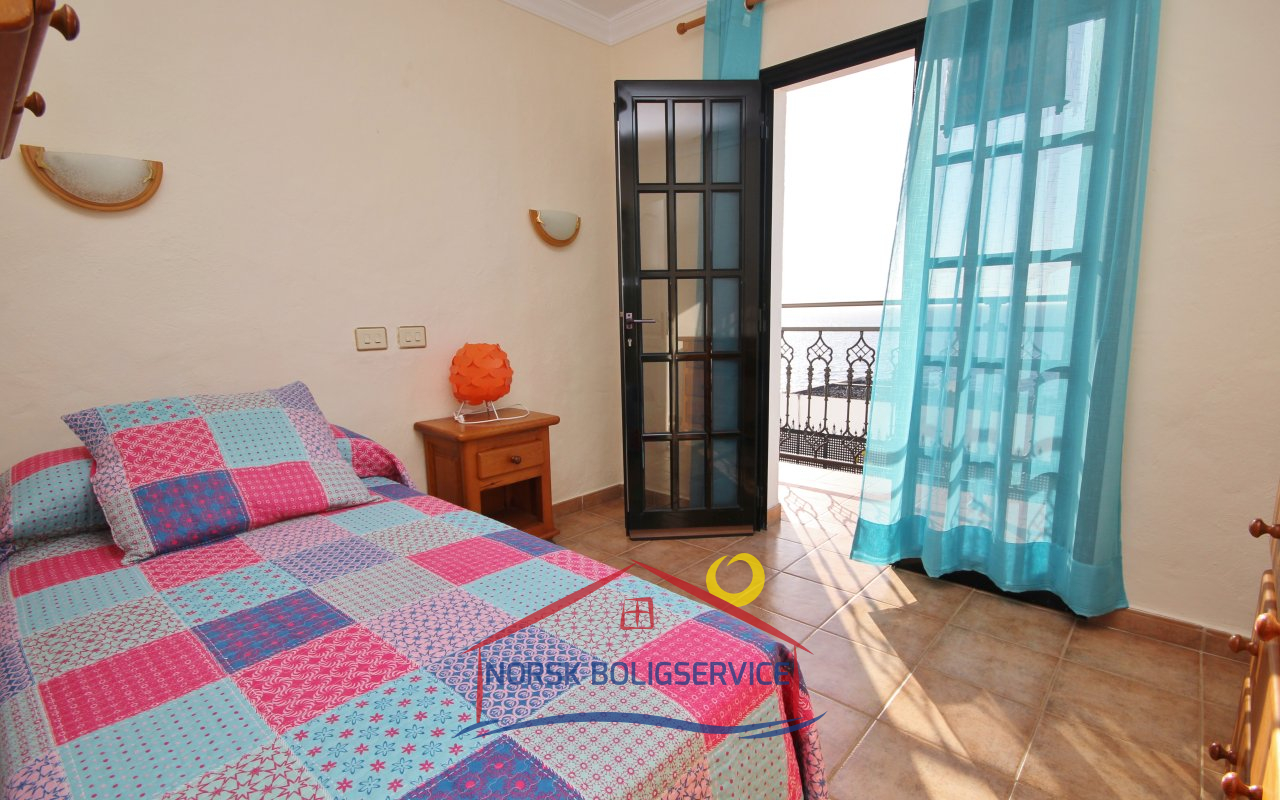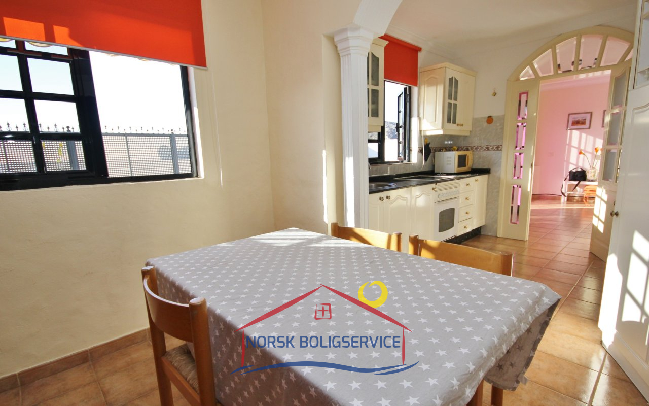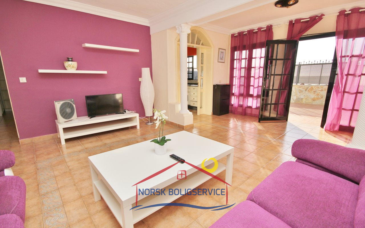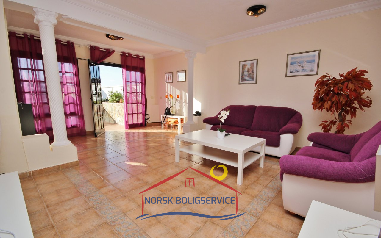 Fott rekkehus i Los Caideros. God standard. Stor solrik terrasse og balkong med flott havutsikt. 3 soverom og 2 bad med dusj. Separat kjøkken. Flere bassenger i komplekset. 5 minutter til Anfi- og Balito-strendene, nær den norske skole.