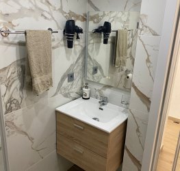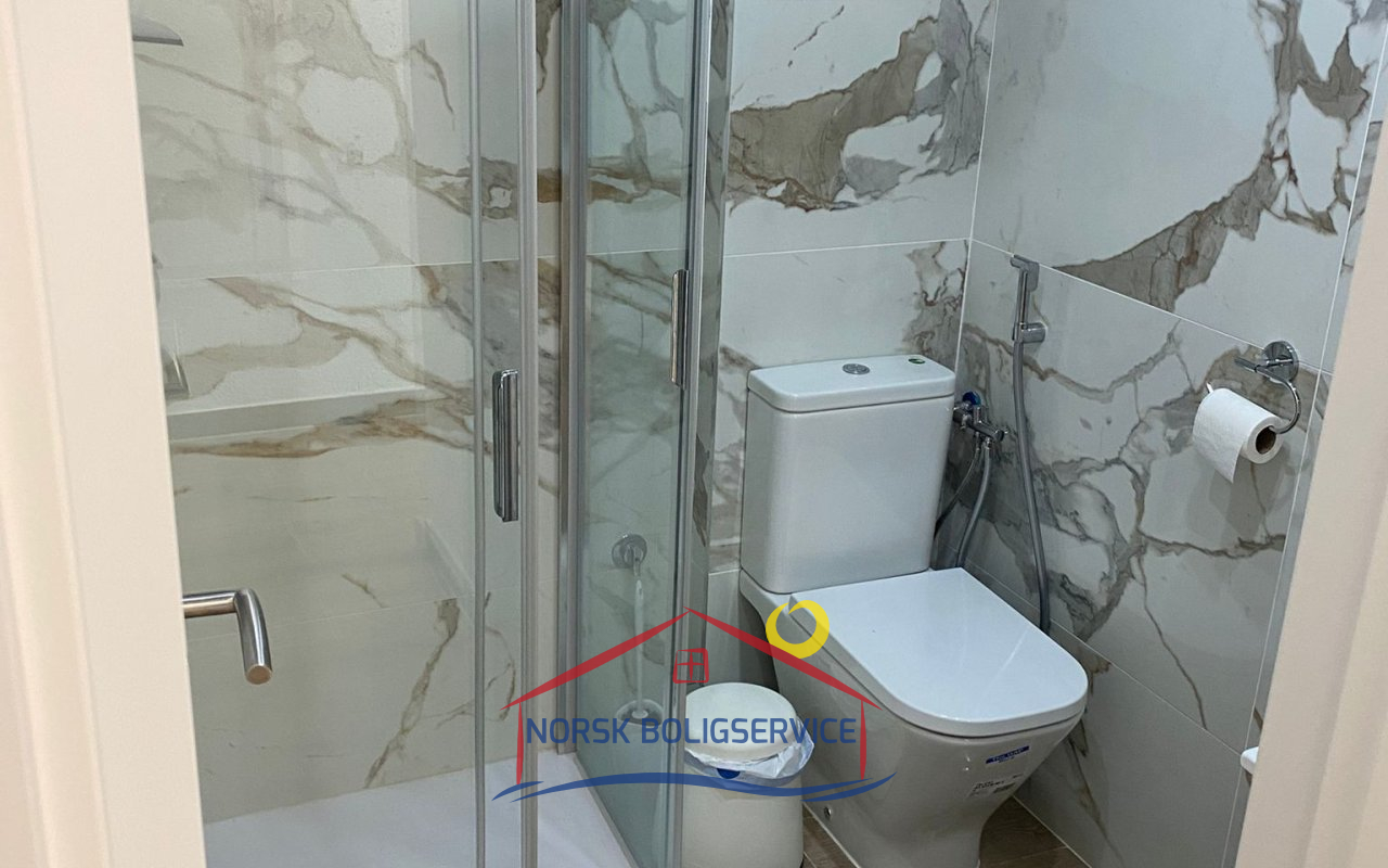 Komplett bad med dusj, moderne og funksjonelt.