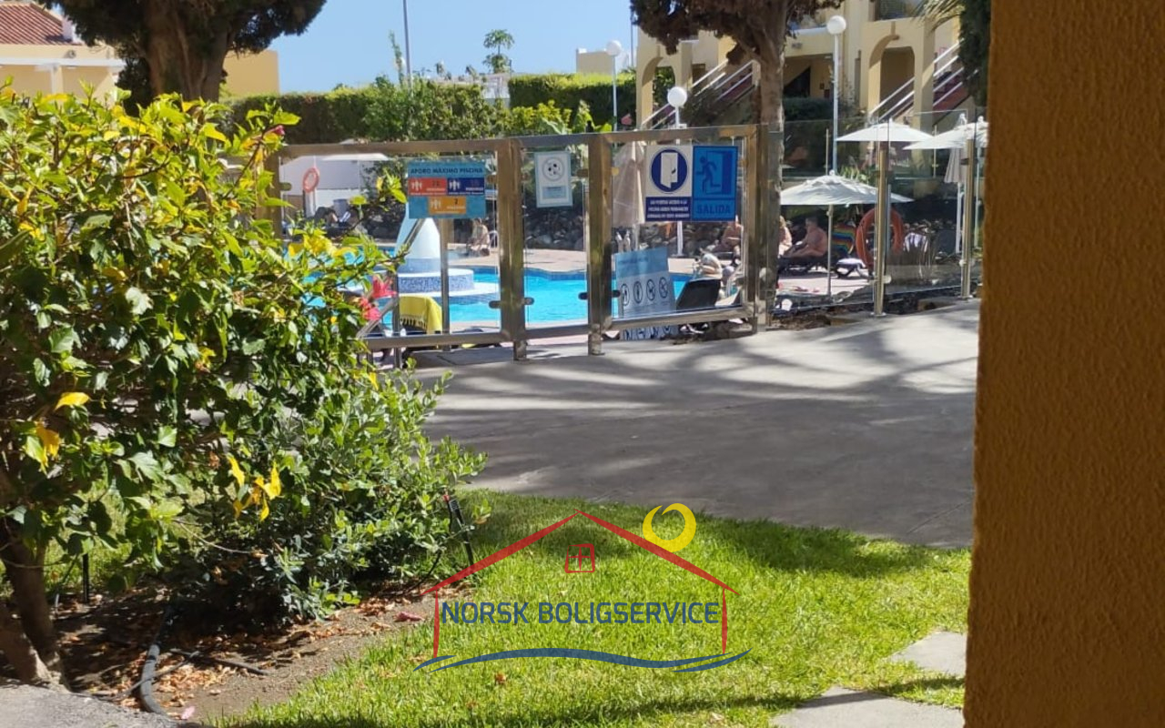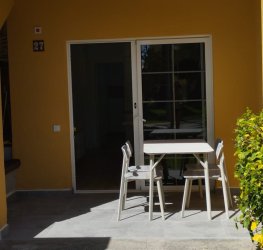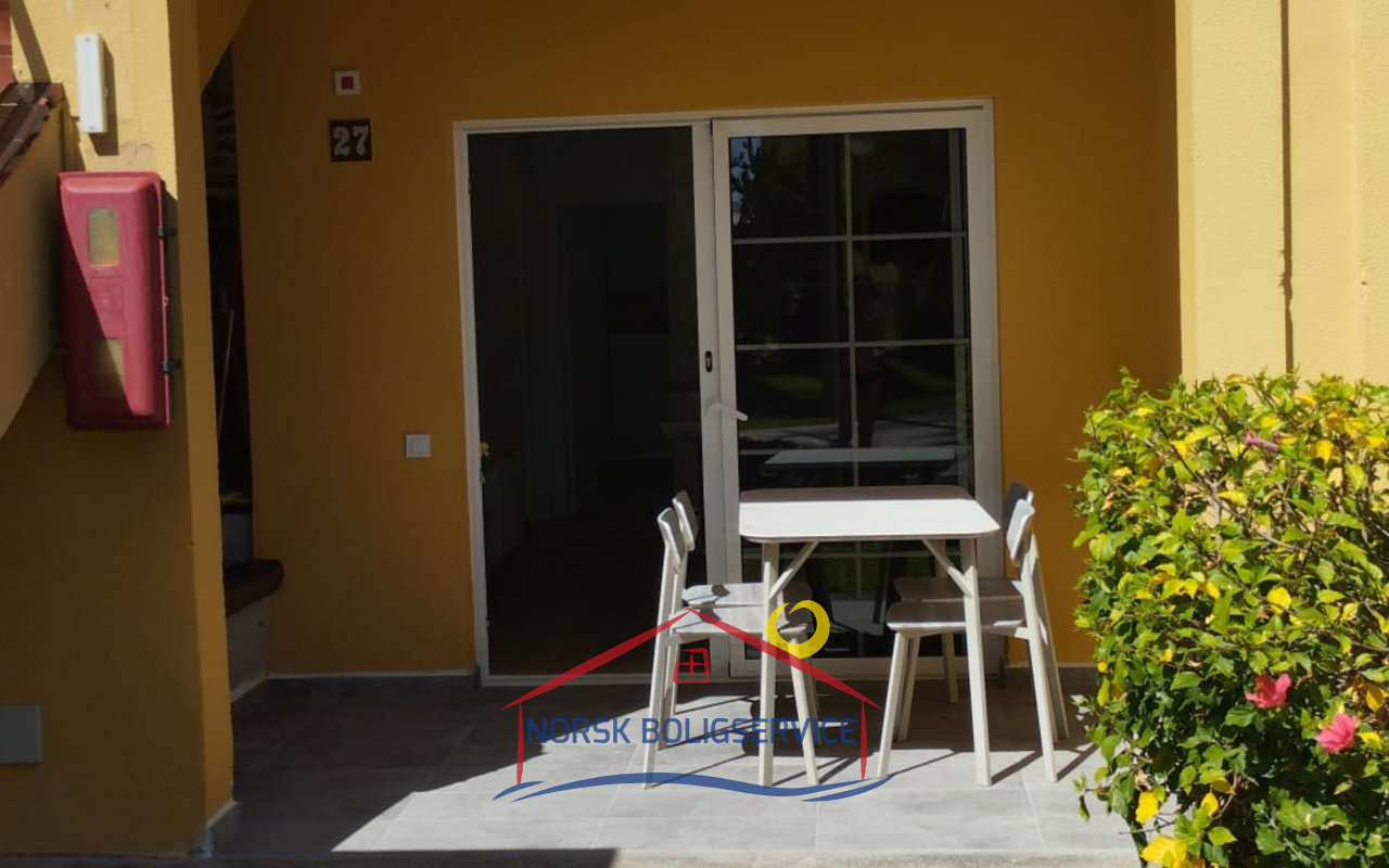 - Koselig terrasse med liten hage. Dette er et ideelt område for å nyte måltider eller fritid sammen med en partner. Terrasseområdet har bord, stoler og en liten sofa mot veggen. Herfra kan man se svømmebassenget og ha enkel tilgang da det er på bakkeplan.