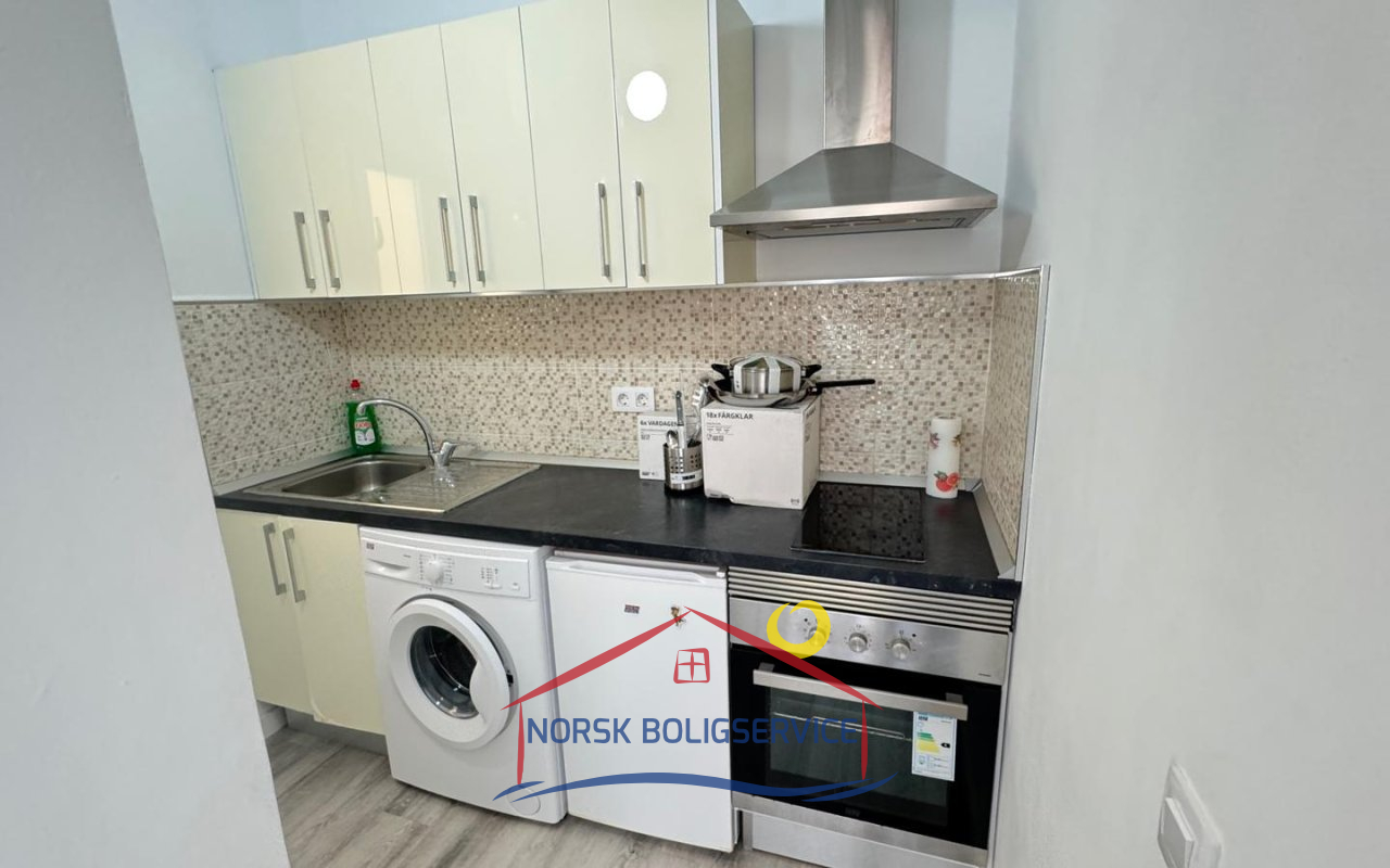 - Kompakt, fullt utstyrt kjøkken, adskilt fra stuen.